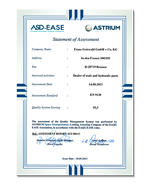 Zertifizierung des Qualitätsmanagementsystems nach European Aerospace Supplier Evaluation (ASD/EASE) Standards für die Bereiche Dichtungen und Hydraulikteile.